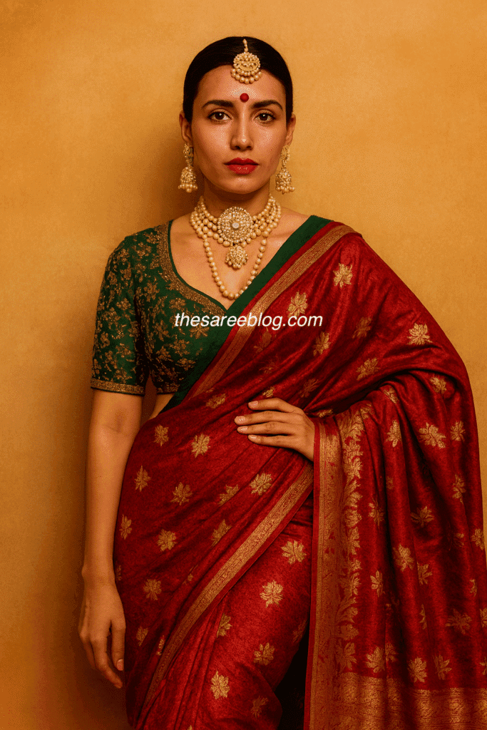 Style tip: Pair it with traditional gold jewelry and a matching red blouse for a regal look.