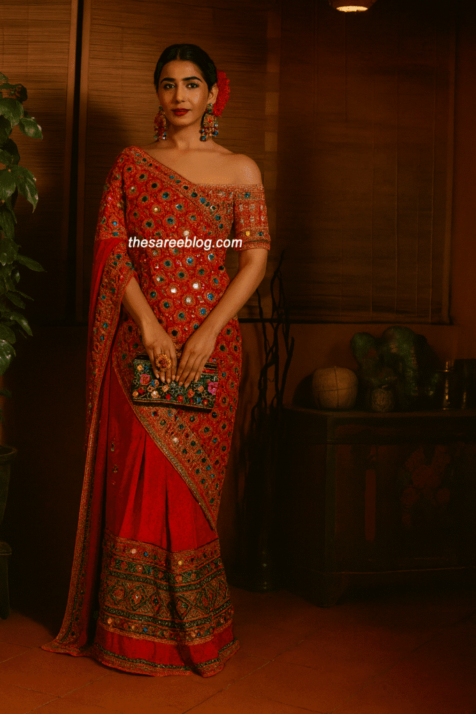5. Red Mirror Work Saree With Off-Shoulder Blouse
