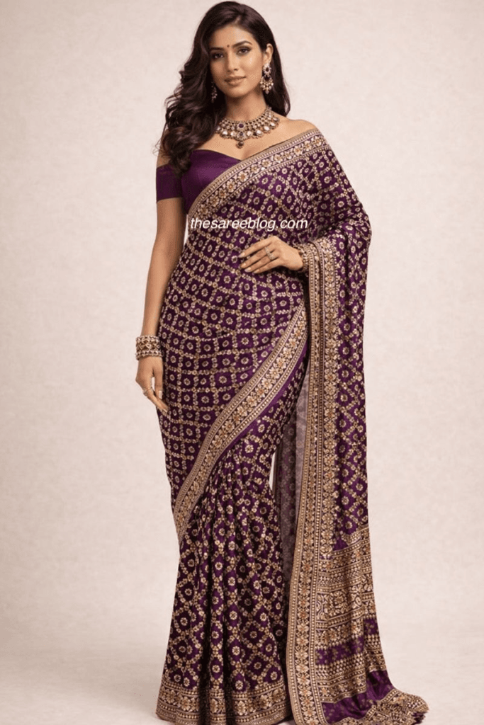 When chikankari is paired with richer fabrics like Banarasi silk, it transforms. A deep purple chikankari Banarasi saree creates a look that feels regal and commanding. It holds presence without losing refinement.