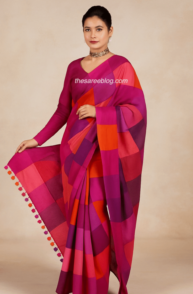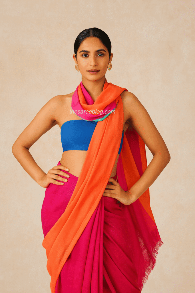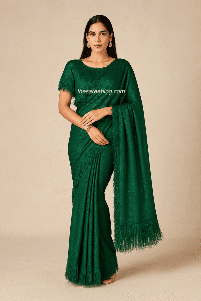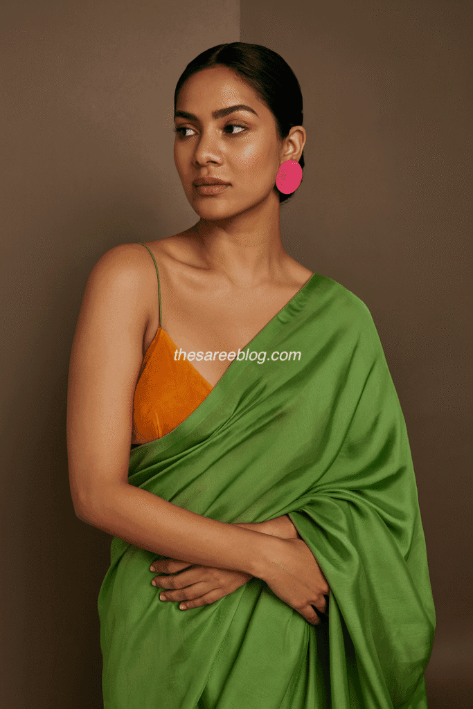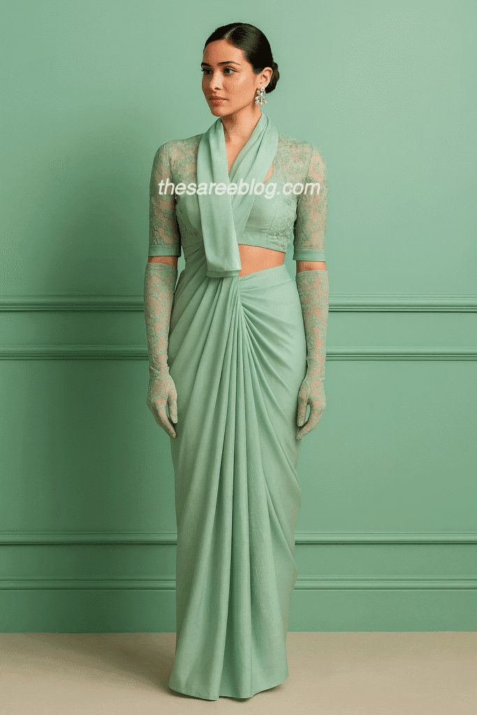 Sometimes, the blouse can be the hero. Balloon sleeves, bishop sleeves, or cape sleeves add drama without changing the saree drape.