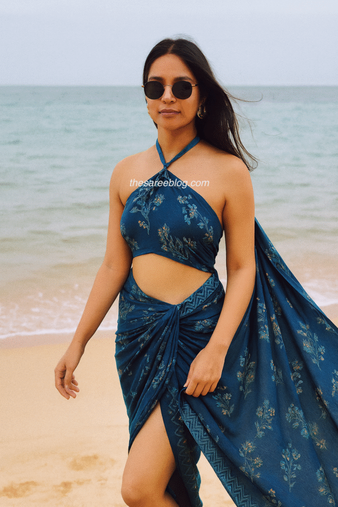 Pair a breezy saree with a bikini or bandeau top, tie the pallu at the hip, and wear it with oversized sunglasses for a luxe holiday look.